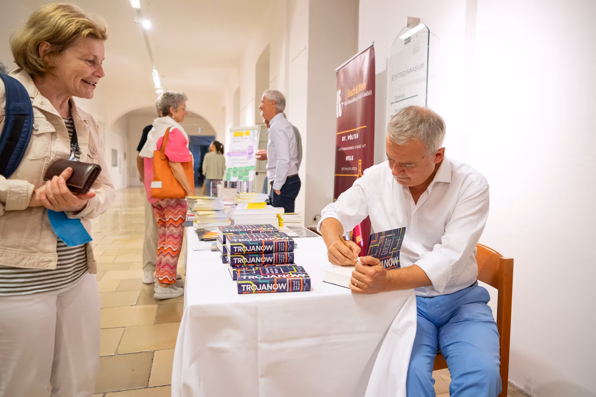 Ein weiterer unbestreitbarer Höhepunkt wartete am Abend auf den vollbesetzten Kolomanisaal: Ilija Trojanow präsentierte in einer hinreißenden Leseperformance gemeinsam mit den Jazzmusikern Wladigeroff Brothers zum ersten Mal seinen neuen Roman „Tausend und ein Morgen“, einen kühnen utopischen Roman, in dem er seine Protagonist*innen als Zeitreisende durch die Jahrhunderte schickt, immer mit dem Versuch, an kritischen Punkten der Geschichte einzugreifen und im richtigen Moment das Zünglein an der Waage zu sein um das Geschehen zum Guten zu wenden. Ob das gelingen kann? Und zu welchem Preis? Der erzählgewaltige Abend, in dem Trojanow alle Register seines Könnens zog, riss das Publikum zu stehenden Ovationen hin.